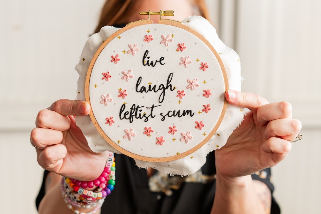 Perhaps empathy was the main driver behind what many of the attendees were working on that lovely afternoon – a mixture of textile art and political dissent. Although empathy has recently gotten the boot from a surprising amount of podcasters, politicians, and pastors as they believe it “manipulates caring people into accepting all manner of sins including abortion access, LGBTQ+ rights, illegal immigration, and certain views on social and racial justice”, it seems that many folx simply refuse to let that part of their humanness go. And judging from the conversations that were taking place that day, they were also urgently trying to find solutions for local problems through networking and knowledge sharing. All while stitching an embroidered hoop with emphatic pleas and expletives whilst sipping on a couple cold ones. (What can I say? We are multi-taskers).
